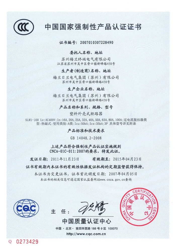 SLM1-100塑殼斷路器資質(zhì)證書
