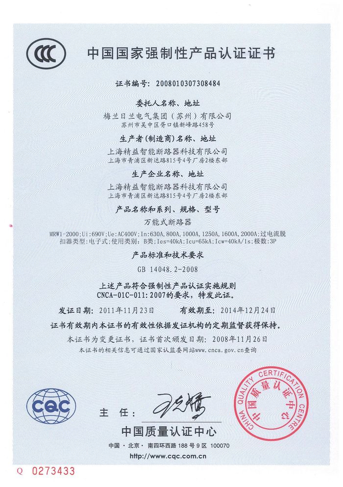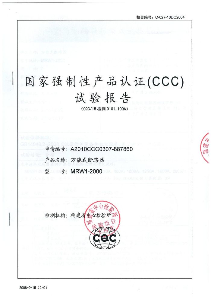 MRW1-2000萬能斷路器資質證書