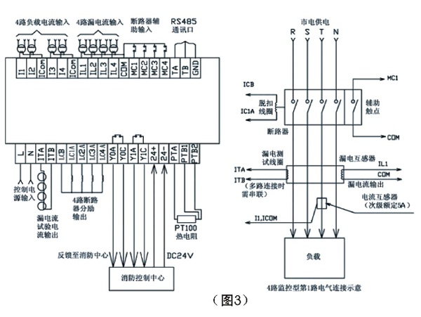 3、分體式剩余電流監(jiān)控探險(xiǎn)測(cè)器端子圖和外接線路圖
