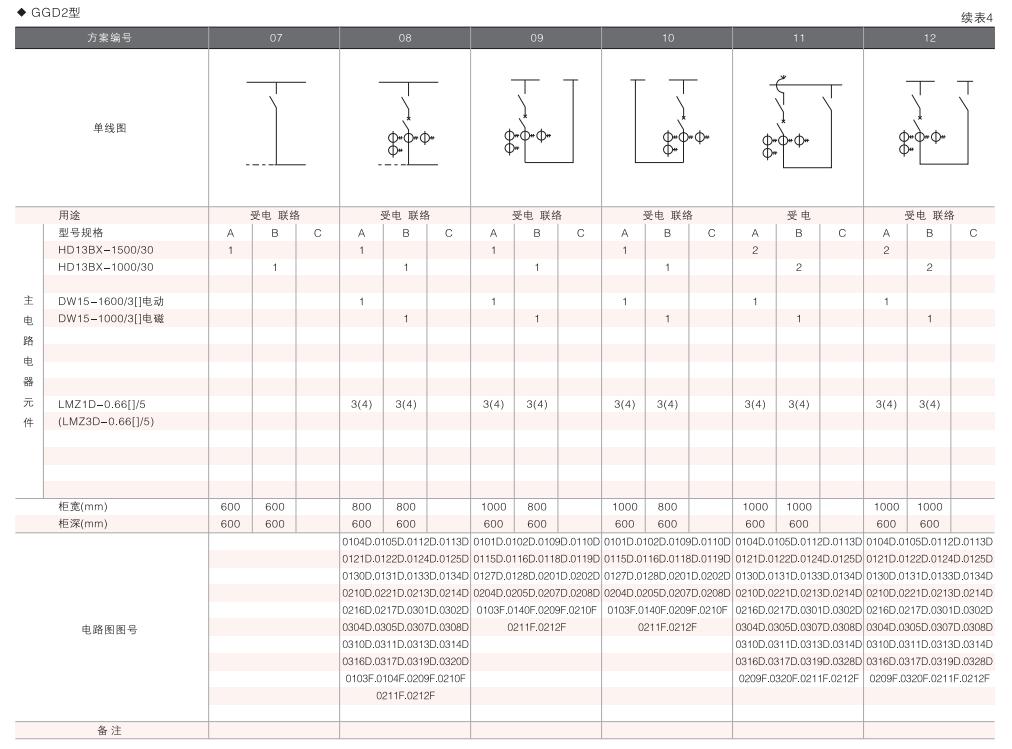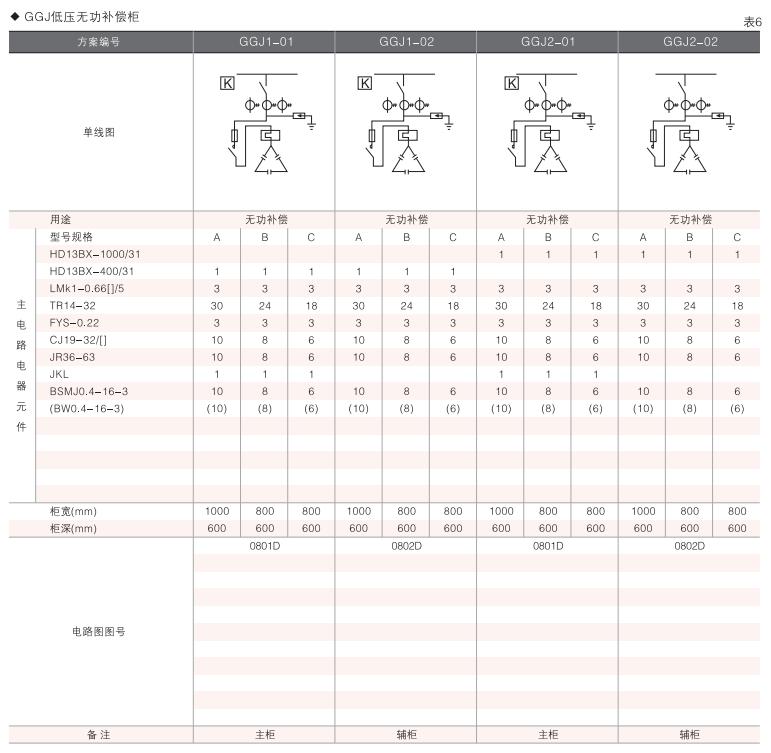 此外,為適應(yīng)無功補償?shù)男枰O(shè)計了GGD電容補償柜,其主電路方案4個,共12個規(guī)格。